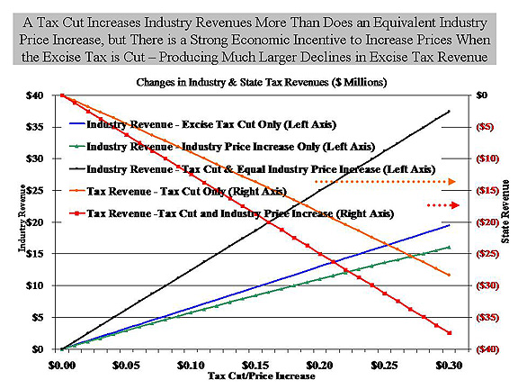 “Industry revenue (net of excise taxes) is estimated to increase by $6.5 million with a $0.10 decrease in the states excise tax. However, if the industry increases prices by the average over the past 20 years ($0.10 – the median is $0.08), industry revenue increases by an estimated $12.5 million. Clearly there will be a strong incentive to capture the potential surplus from an excise tax decrease (rather than allow it to be passed on to consumers). At the same time, a $0.10 excise tax decrease will lower state government cigarette tax revenues by $9 million, but if the industry raises prices by $0.10 then revenues will decline by $12.5 million.”