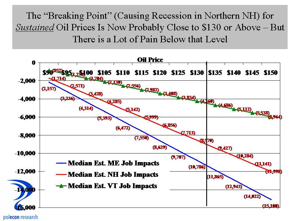 Higher oil prices act like a tax increase on the consumer, reducing disposable income and resulting in a shift in purchases away from some goods and services to pay for higher energy costs. In addition, high energy prices (especially gasoline prices) have a tremendous negative psychological impact on household and consumers confidence and sense of economic well being. How much is too much of an increase in oil prices in Northern NE? At what point do higher oil prices (which largely determines gas prices) tip the region into recession? Based on the same models used above, the point at which slower job gains or actual job losses would occur is probably at a sustained price (for months on end) of at least $130 to $135 bbl. But that changes depending on economic conditions and is also a function of the energy intensity of each state. Strong economies can take more shocks without falling into recession. In a weak economy it takes a smaller oil price increase to induce recession. In NH, the breaking point price is now probably closer to $125 – $130 bbl, and in Maine a bit lower, while in Massachusetts, the price that would induce recession is probably closer to $140.