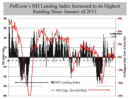 PolEcon’s NH Leading Index jumped from a revised + 3.7 to +13.0 this month. its highest value since January of 2011. An Index reading of + 13.0 isn’t a signal of robust growth but it is a substantial improvement over much of the past 18 months and if it continues for another month or two it will be a clear sign of a much improved NH economy.