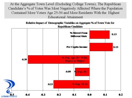 Of course the percentage of voters registered in each party in a town is the single largest determinant of the percentage of votes received by the party’s candidate, but after and controlling for that, what other variables were significantly related to the election results? The chart below shows the most important demographic variables (at least the most important of the 30 or so I examined). The bars are standardized results (z scores) that show the RELATIVE importance of the variables in determining the percentage of the vote that went to the Republican candidate.