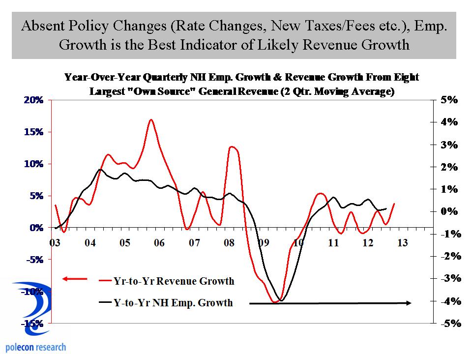 Tomorrow I will present a number of charts and talk about a number of factors that influence various revenue sources but the bottom line is this: until we have more than tepid employment growth, revenues aren’t going to grow significantly and forcing them to grow (via a major policy change) will not contribute to stronger job growth. That isn’t the same thing as saying “any policy change (rate adjustment etc.) will harm job growth and revenue growth in the long run.” NH’s unique fiscal system has survived far longer than many thought possible (and longer than many wanted it to survive) because of balance – those on the left of the political spectrum had to be satisfied with the state doing what it “needed to do” rather than what it “wanted to do” and those on the right had to be willing to allow for some adjustments in tax rates and revenues to keep call for major policy changes at bay. I think that worked pretty well for a long time but it only works when their is a modicum of flexibility and compromise in the policymaking process. That, in fact, may be the best estimator of revenue growth moving forward and you don’t need an expert panel of wonks and nerds to tell you that.