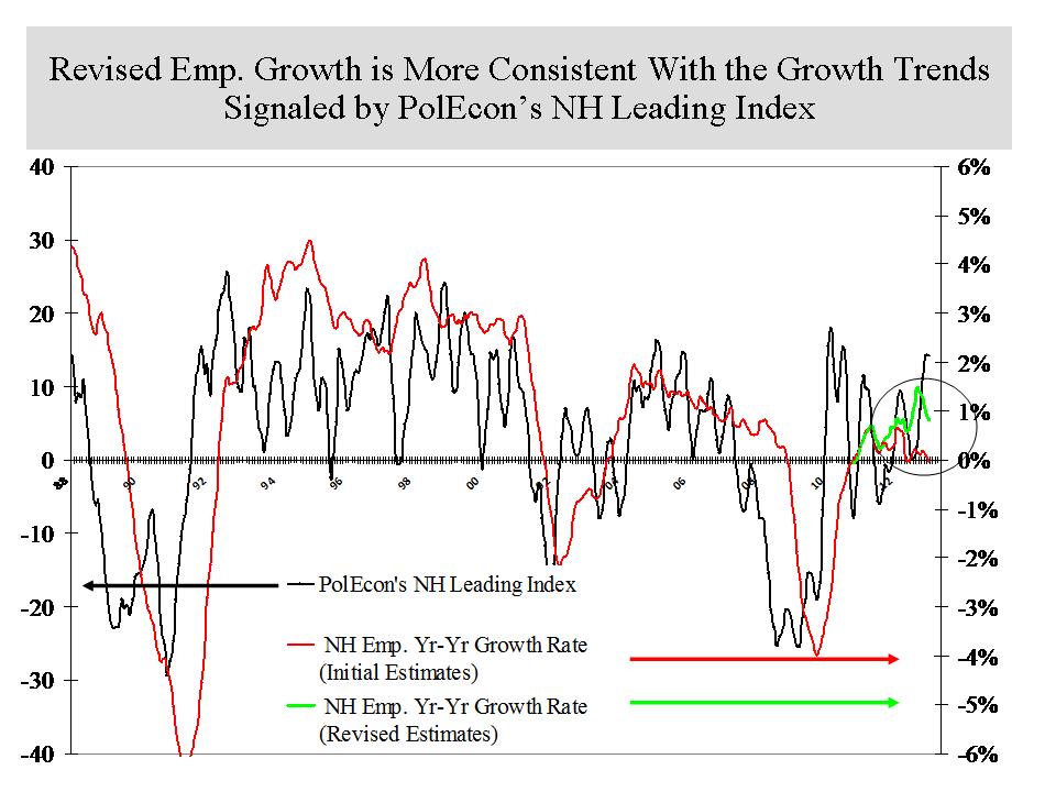 The revised job numbers also are more consistent with PolEcon’s NH Leading Index which had been signalling stronger employment growth in NH than was first reported. The revised job numbers are more consistent with the signals provided by the Leading Index. That may not mean much to anyone but to me it means I won’t have to spend a lot of time re-calibrating the Index and that means a more enjoyable weekend. Enjoy yours.