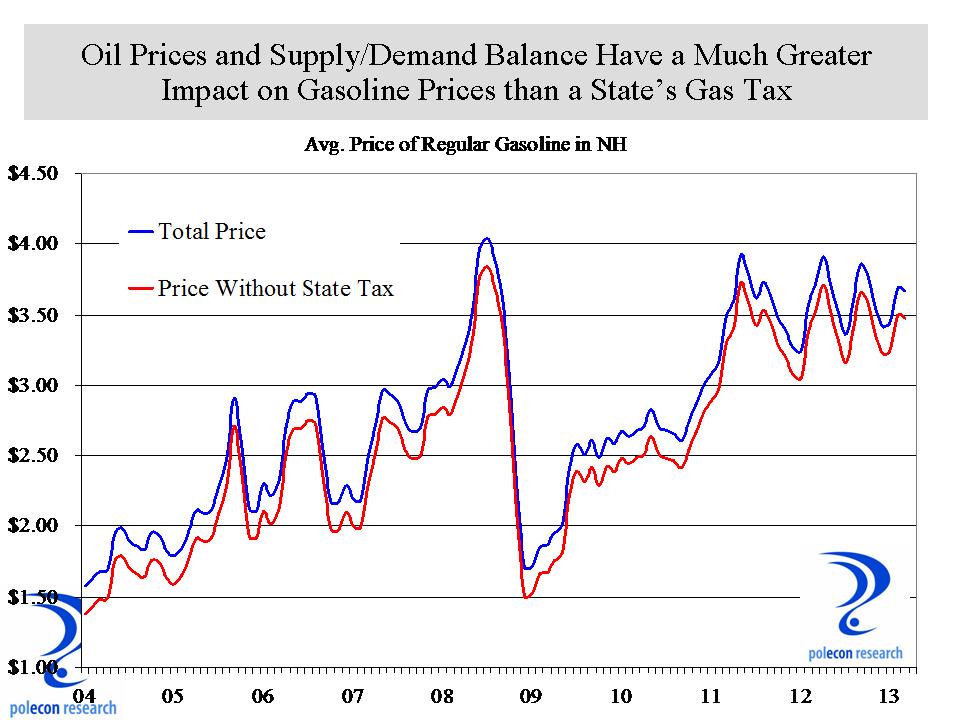 Despite all of the attention to gasoline prices and proposals to raise or lower gasoline taxes over the past decade there has been surprisingly little research on the retail price impacts (or “pass-through” effects) of changes in gasoline taxes. That may be because changes in gasoline taxes are relatively small (usually a few cents) compared to the much larger price changes that occur as a result of supply/demand issues and variations in the world-wide price of oil. The chart below shows how gasoline prices in NH have changed since 2004 and it also shows the theoretical price if the state had no excise tax on gasoline. The red line shows the theoretical prices because, like cigarettes, retail prices may or may not be reduced by an equivalent amount if the gasoline tax were lowered.