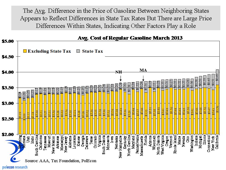 The demand for gasoline, like cigarettes, is relatively inelastic so it takes a surprisingly large price increase to change consumption very much but differences in prices among locations may shift the location of some gasoline sales where consumers can conveniently choose where to make their purchases. I can buy gasoline as easily in Maine as in NH and with a little more effort I can also buy in MA. I often can get gasoline as or even a bit cheaper in MA than in the town where I live, but I can’t get gasoline cheaper in Maine. I can also get gasoline cheaper if I drive a few miles to towns just north and south of me, or even to a gasoline station on the other side of town. These price differences are often $.10 per gallon and occur among retailers of similar types – i.e. gasoline stations with a convenience store, the same brand convenience store selling the same brand of gasoline. Nevertheless, when I look at the average price of gasoline between neighboring states (with some exceptions like California where environmental regulations have large retail price impacts), the differences in price appear to be strongly related to differences in state tax rates (r=.82). Comparing statewide average prices and tax rates for gasoline masks much of the variation in pricing that occurs within states and even within communities. That is one reason why I think policymakers focus so much on tax rates as the primary reason for price differences.