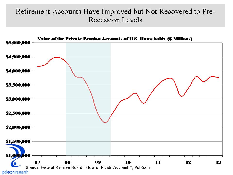 Private retirement and pension accounts represent a much smaller component of the net worth of households but they are key contributor to households’ sense of financial “well-being” and a contributor to the “wealth effect” that impacts household confidence and their willingness to spend.