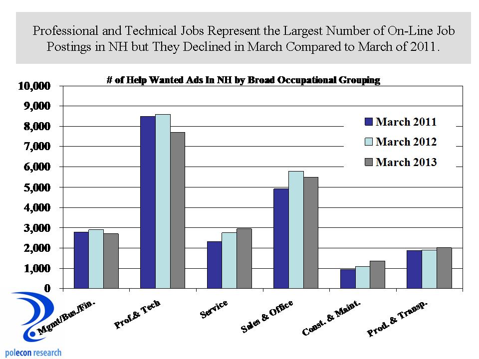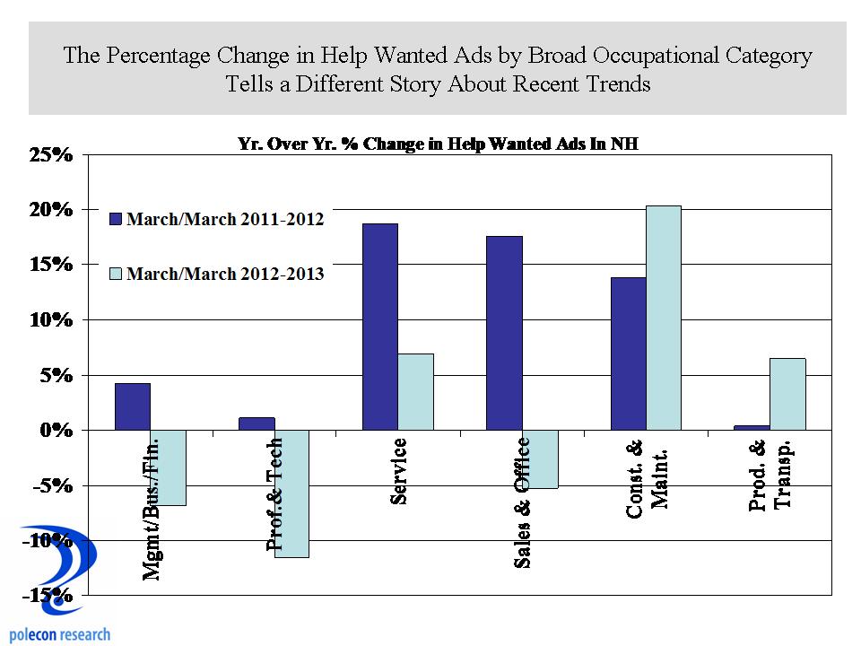 The chart below is less sanguine. It shows that compared to the same month in 2012, March 2013 help wanted ads in NH for professional and technical ads declined by more than 10 percent. One month isn’t a trend but recent months have shown more weakness than strength in this indicator. The chart also shows that the largest improvements in labor demand are not among the most skilled occupations, although changes in the occupational make-up of manufacturing industries makes it increasingly likely that production workers will have higher levels of education, training and skills.