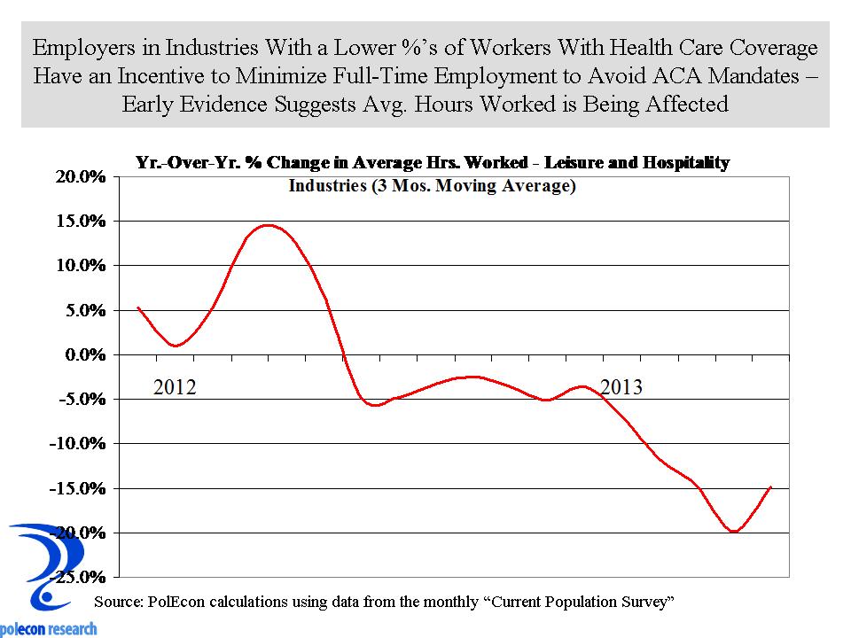 It is still to0 early to make claims about negative employment impacts from the ACA but the evidence is beginning to point to some troubling impacts. As we move toward the implementation date for the ACA any employment impacts will become clearer as employers looking to avoid mandates get closer to finalizing the employment level averages that will be used to determine their inclusion or exemption from ACA mandates. Empirically it may be too early to make a definitive call on the ACA’s employment impacts, but based on what I see as the incentives inherent in the ACA, it is just a matter of time before the call gets made.