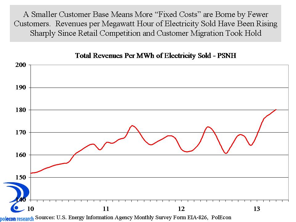 As PSNH’s electricity customers switch to competitive suppliers revenues decline, and more importantly for the future of the market, the customer base shrinks. For a company like PSNH with high “fixed costs” in electricity generating plants and other system costs, these fixed costs do not shrink with a reduction in electricity sales or a decline in the customer base . The result is that fixed costs are recovered from a smaller number of customers which of course leads to higher prices and a further migration of customers and still greater costs for the smaller number of customers of that remain. For an electricity provider with high fixed costs and a regulatory system that allows those fixed costs to be recovered from its customer base, revenues will not decline in proportion to declines in electricity sales. As the chart below shows, the decline in PSNH’s electricity sales has been much larger than has been the decline in its revenues from electricity sales.