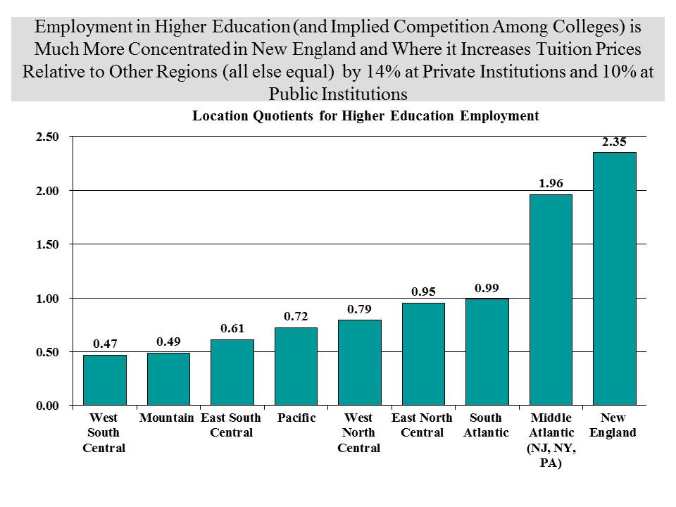 As an example, New England’s location quotient of 2.35 is about 140 percent larger than is the location quotient (or concentration of higher education employment) in the South Atlantic region. The elasticity of tuition and fees at private colleges with respect to this measure of competition suggests that for every 10 percent increase in higher education competition in a region, tuition and fees will be one percent (1%) higher. Thus the 140 percent difference in higher education competition in New England compared to the South Atlantic region implies that all else equal, we can expect tuition and fees at private colleges in New England to be 14 percent higher than in the South Atlantic region. For public colleges, with a smaller elasticity of tuition and fees with respect to competition, these results imply that tuition and fees would be about 10 percent higher in New England as a result of higher levels of competition among colleges in the region.
