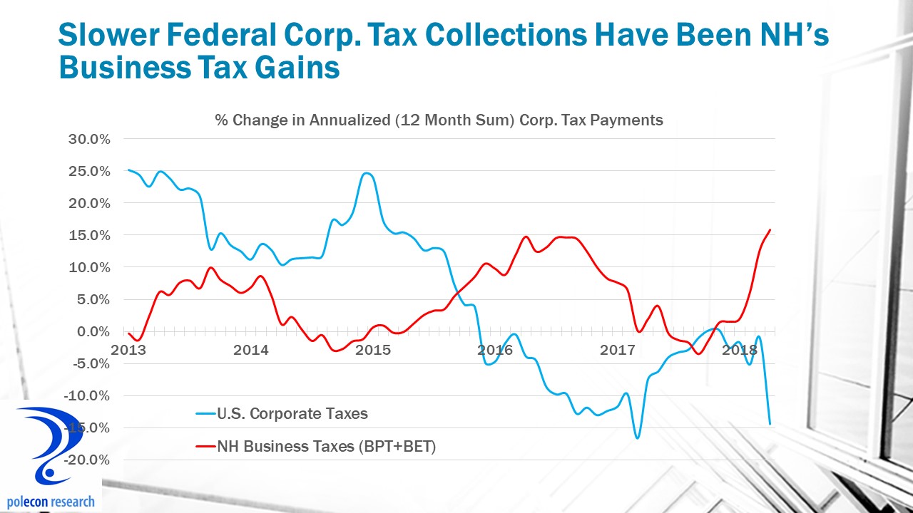 I have argued in prior posts that lawmakers should be cautious in budgeting because revenue growth in NH, although growing, was growing more slowly. I did not foresee a $100 million budget surplus but who did, and who knew what the impact of federal tax reform would be. No public hearings or discussion of the federal tax reform proposal were held and in any case nobody was certain whether changes in corporate tax laws would pass. Growth trends in most of NH’s key sources of state revenue have been modest even as federal tax reform quickly and dramatically altered NH’s business tax revenue trends, greatly improving the state’s fiscal position in the process. I believe that fundamental underlying revenue trends still argue for caution in state budgeting, but when the federal government’s actions contribute to a state surplus NH is happy to say “yes please and thank you.” Lawmakers would be wise , however, not to assume that cuts in the state’s business taxes are responsible for the growth in state tax revenues or that larger cuts will add to the surplus.