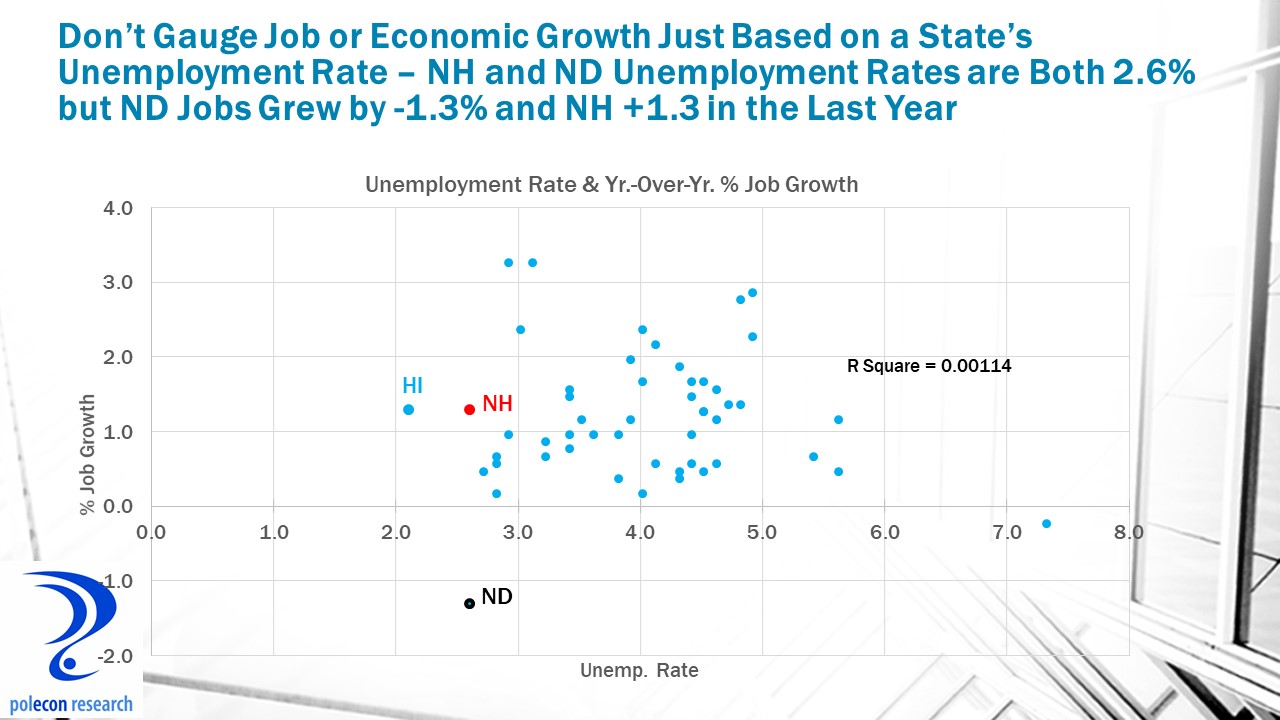 The same is true when state unemployment rates and the annual growth in state gross state product (the broadest measure of economic growth) are plotted (chart below). In 2017 NH tied with Michigan for 25th among states for growth in gross state product (at 1.9%), despite NH having a 2.6% unemployment rate while Michigan’s rate is 4.7%. The scatter plots above and below urge caution in using unemployment rates to gauge economic growth in a state, especially now that slow labor force growth is contributing to low unemployment rates and acting as a binding constraint on economic growth in many states.