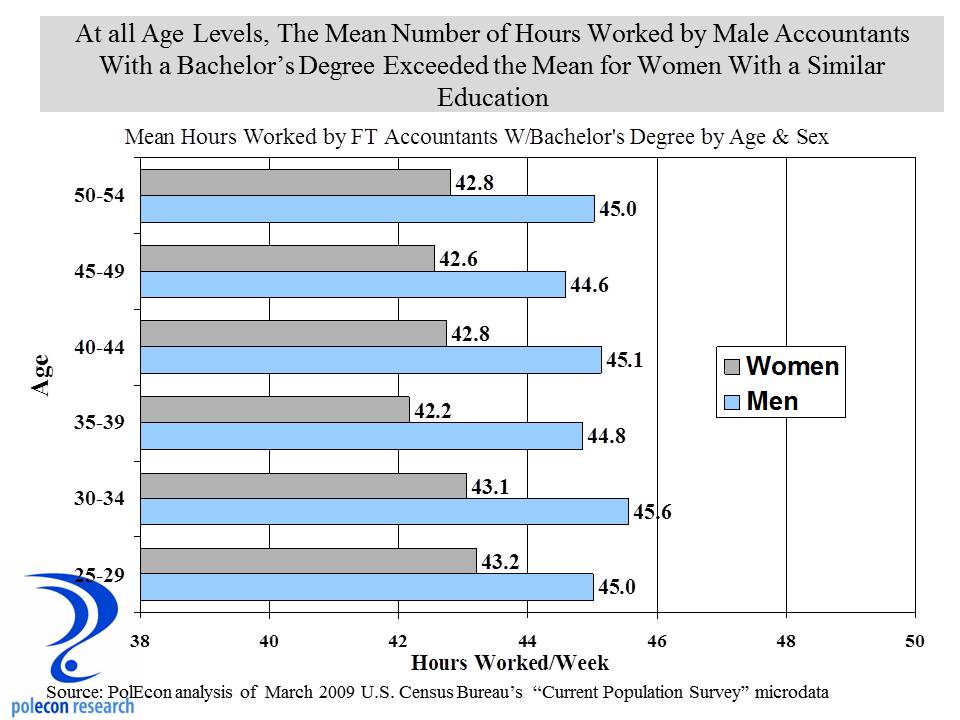 At all age levels, women in accounting worked (on average) fewer hours weekly than did men (Figure below). This was true for women with and without children and whether they were married or not. Regression models show that each additional hour worked per week actually added more to the annual wage and salary of women than to men ($641 to $568). This suggest to me that women are rewarded equally for additional labor and that some of the wage gap in accounting is simply attributable to the longer (on average) hours worked by men.
