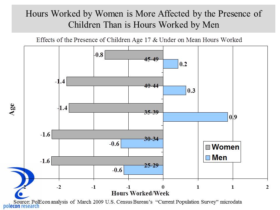 The figure below shows some of the wage and salary impacts for men and women of different variables. Interestingly, marriage seems to have a much more positive impact on the earnings of men than it does for women, adding $3,415 to earnings of men but just $920 for women when controlling for other variables (i.e. age and hours worked, children, etc.).